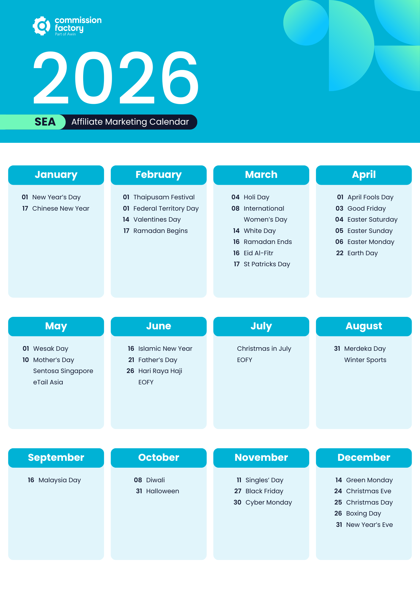 With so many exciting and important dates lined up for 2026, now is the time for brands and affiliates to plan ahead. Become familiar with these key moments and start planning early for a successful year. Download Commission Factory’s 2026 Affiliate Marketing Calendars today to simplify your preparations for the year ahead.